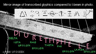 August 1, 1998. Two years have passed since the original publication of the Roswell Glyphics Deciphered. Since that time, a new perspective on the translation has come to light and confirms the original translation. I have been able to match the photo that appears in Ray Santilli's ALIEN AUTOPSY FILM with the transcribed image that appeared on the Internet a year before the video's release. Some have commented that if the Santilli video is a fake, then the photo clip of the I-beam is also bogus. This argument does not necessarily prove the latter is the case. The Santilli film may have been a clever disinformation campaign to discredit the Roswell scenario. Anyone who has studied conspiracies and disinformation can tell you that the best way to conceal the truth is to mix it with a lie. I have reason to believe that the I-beam photo is genuine and was intentionally placed in the film for whatever reason unknown at this time. The graphic at the top of the page is a comparison of the transcribed image (strip across top of image) with the original photo. It is a high contrast enhancement to bring out the inscriptions more clearly. The glyphs are actually inverted. The normal photo shows someone holding the I-beam in his hands. When you compare the transcribed symbols with the inscriptions you will see that they correspond exactly! But what is wrong with this picture? The glyphics in the photo are "inside out!" The I-beam is being held wrong side forward. The embossed symbols must also appear on the other side of the I-beam material which was described by the sheep rancher, Mac Brazel, as being lightweight. You will also notice that the I-beam is broken in the lower right corner section. The Greek letter "Epsilon" is in this position. The correct sequence, left to right, is ELEPHTHERUID. I have since come across a later translation of the symbols in this photo from a Sr. Ricardo F. Arantes of Brazil (whose article is in Portuguese). He presents a very interesting interpretation of the translation, but reads the alphabetical symbols "left to right." His interpretation is based on the letters being in the reversed sequence: DIURENETHEA. "DI (of) URENTHEA." This he "rounds out" to URANTIA. The thread is about 2000 pages long! It is very possible that both interpretations apply. But that's a subject for another report. Now, we must go back a little over two years ago to the original article published on March 26, 1996 for the story behind the Roswell I-beam translation and the meaning of the word "ELEPHTHERIA!" ©1996, 1997, 1998 by Ignatius Graffeo.